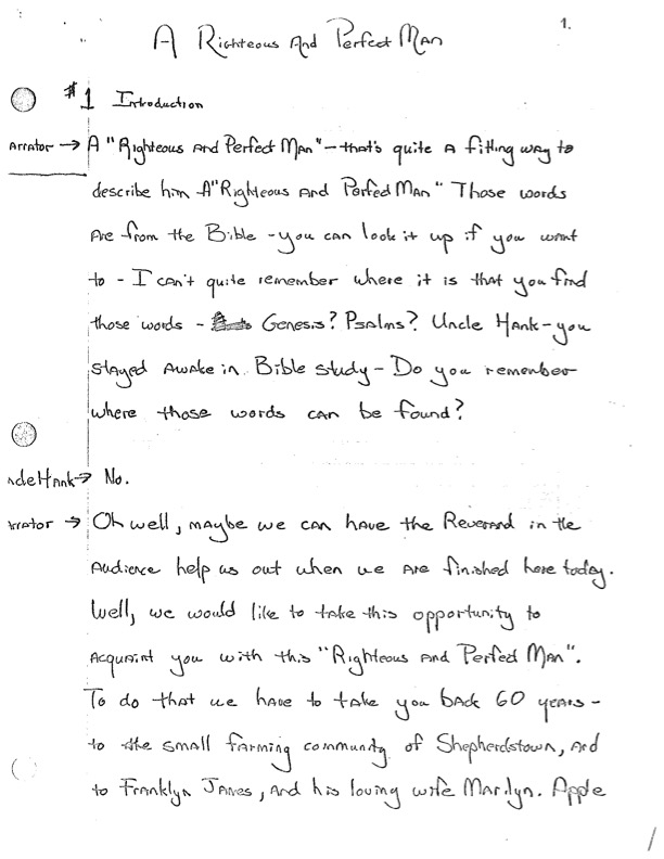 One of the first musicals I created, A Righteous and Perfect Man (ARAPM) is something of a parable, and definitely not your traditional middle school musical. It was conceived around Christmas 1984 and is a result of watching It’s A Wonderful Life. The plot of ARAPM revolves around Stuarte James (based on the actor Jimmy Stewart.) I wanted to present an alternative to the happy ending of It’s A Wonderful Life and other similar stories, such as the story of Job in the Old Testament.